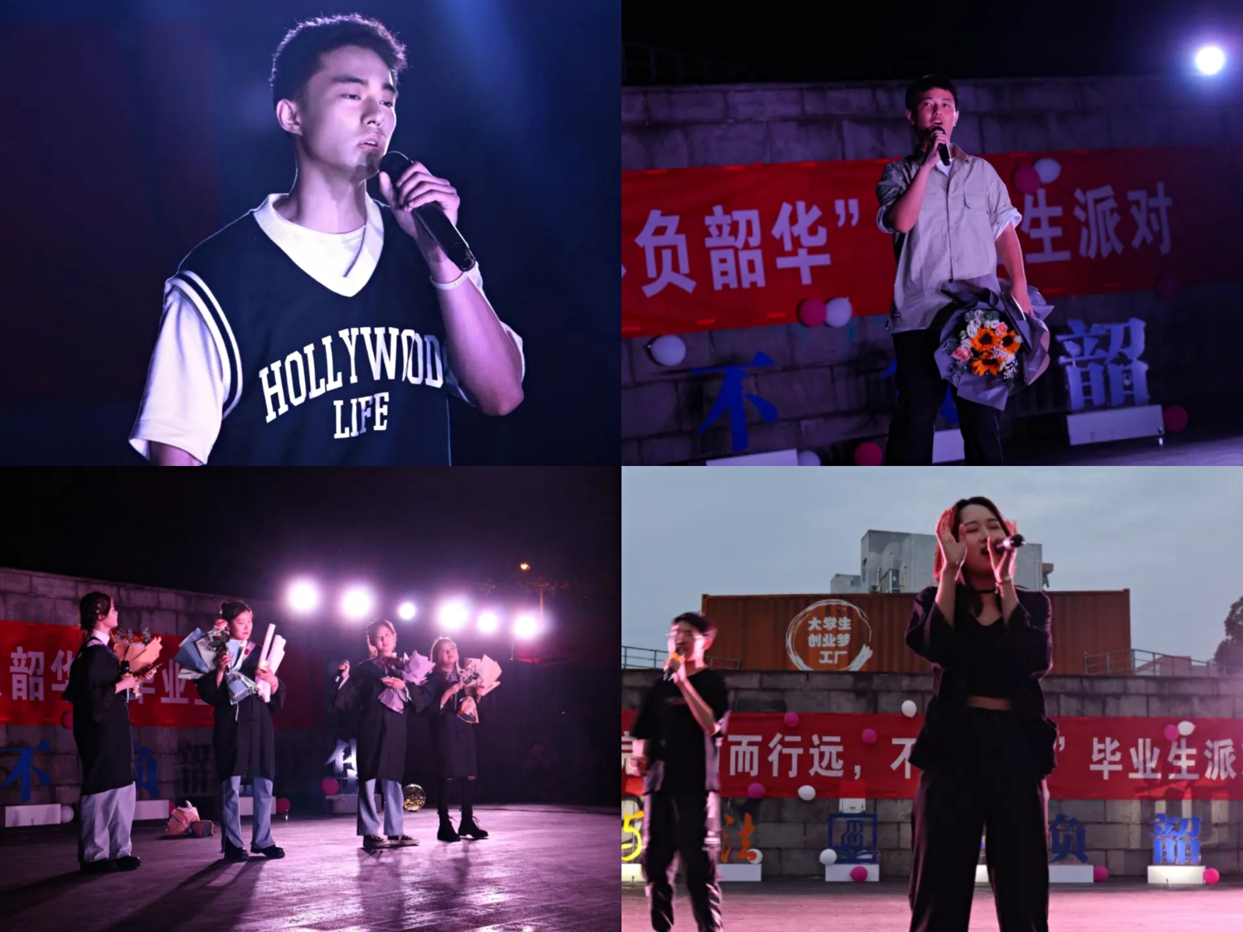 本次派对在毕业回忆的视频中拉开序幕,并以舞蹈节目《Boss》热辣开场,强烈节奏感的音乐节拍,瞬间点燃全场,广大同学报以极高的热情,中间更是穿插抽奖环节和游戏互动环节,增加了观演同学的参与度。舞蹈队与合唱队分别带来精彩的表演——《不服》、《Glisten》、《Rumor》、《红色》、《Boy with luv》与《奔跑吧青春》。演出过程中,时不时会有同学送上鲜花,现场的温馨氛围也逐渐上升。严子咏同学带来的歌曲串烧《所有人都在玩手机》+《夜猫》+《再见再见》,将晚会的氛围点燃到最旺处。随后,伴随着自己设计的视频,法学的许圣航同学献上自己的歌曲表演《理想》。在同学们的欢呼声中,胡鹿鸣老师登台对毕业生们送上寄语,并倾情演唱歌曲《写给黄淮》,博得了全场热烈的掌声。最后,晚会在歌曲《首南东路的日子》和老师们的祝福和毕业生们的留恋与不舍中圆满结束,现场观众也被离别氛围深深地感染。